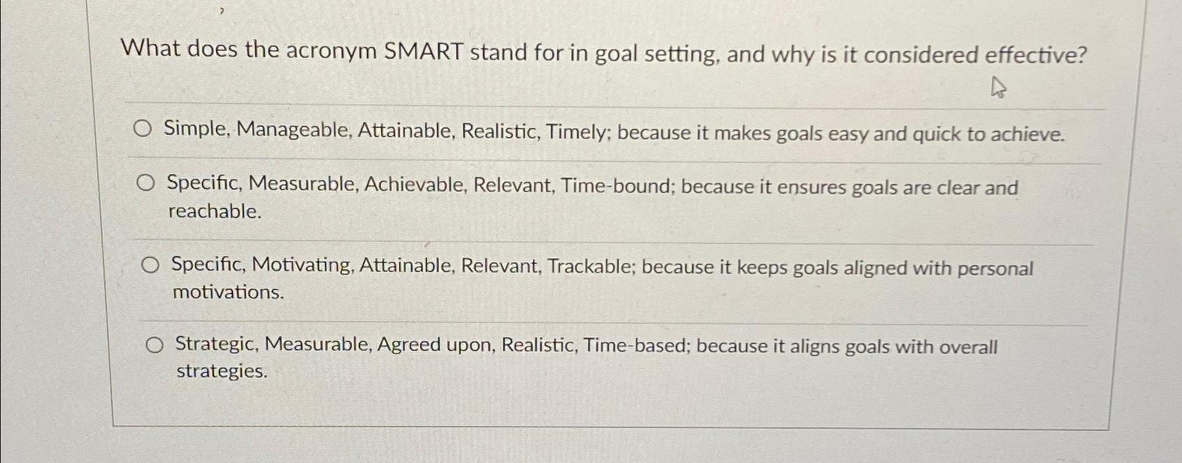 SOLVED What does the R in the acronym SMART stand for?? What Does The Acronym Smart Stand For Eng201 What each letter stands for and it's definition of each aspect of a smart goal. How to write smart goals. Therefore, a smart goal incorporates all of these. — the acronym helps you remember the key aspects of a goal so that you have the best plan for success. How do i write a goal plan? what does. What Does The Acronym Smart Stand For Eng201.
